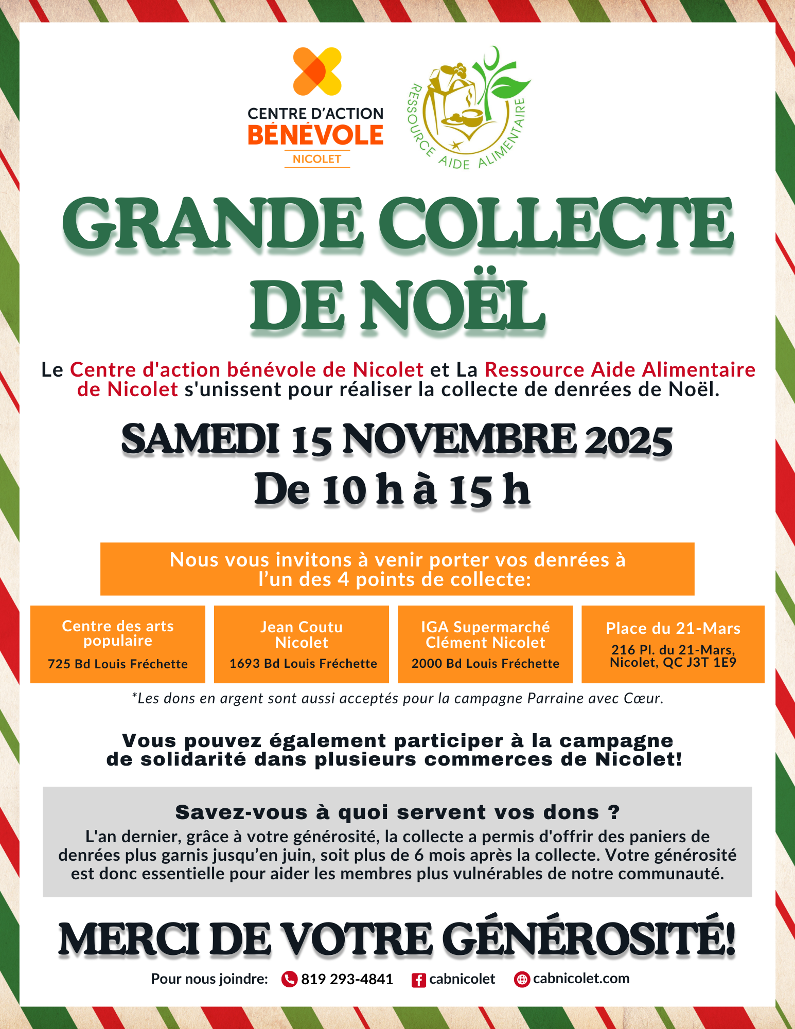 Le Centre d’action bénévole de Nicolet et La Ressource Aide Alimentaire de Nicolet s’unissent pour réaliser la collecte de denrées de Noël. Toutes les denrées seront redistribués dans les paniers hebdomadaires de la Ressource Aide Alimentaire. Nous vous invitons à venir porter vos denrées à l’un des quatre points de collecte: